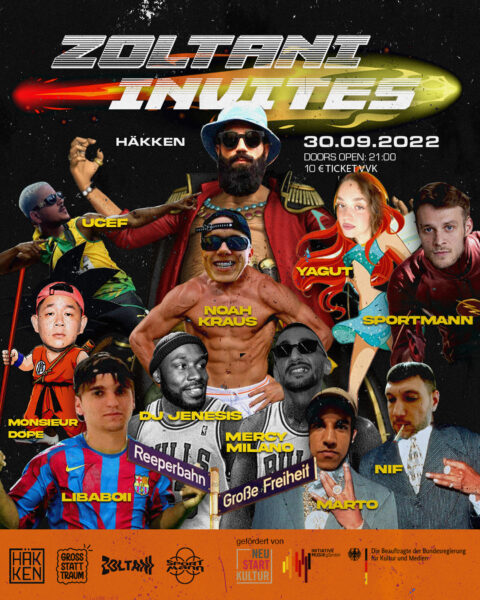 Vorverkauf: 10,00€ zzgl. VVK-Gebühren Abendkasse: tba. Aufgrund der Lockerungen der Covid-19 Regelungen findet das Konzert ohne Einschränkungen statt. Das Tragen einer Maske wird nichtsdestotrotz empfohlen. — ZOLTANI Einlass: 21 Uhr Beginn: 21 Uhr – ZOLTANI invites: First Concert with Ucef, Noah Kraus, Yagut, Sportmann, DJ Jenesis, Monsieur Dope, Mercy Milano, Nif, Marto & Libaboi Temorscha…
