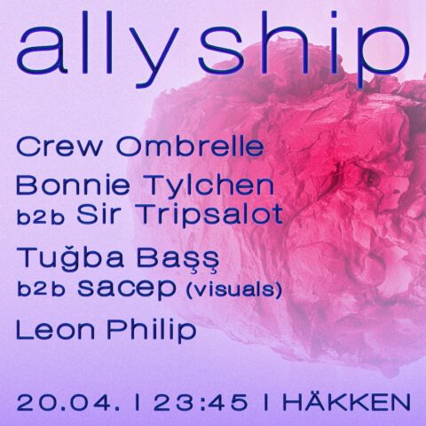Eintritt: 12-15 EUR. Die Einnahmen des Abends gehen als Spende an die Seenotrettung. allyship Beginn: 23:45 Uhr – Line-Up: Crew Ombrelle Tuğba Başş b2b sacep (visuals) Bonnie Tylchen b2b Sir Tripsalot Leon Philip